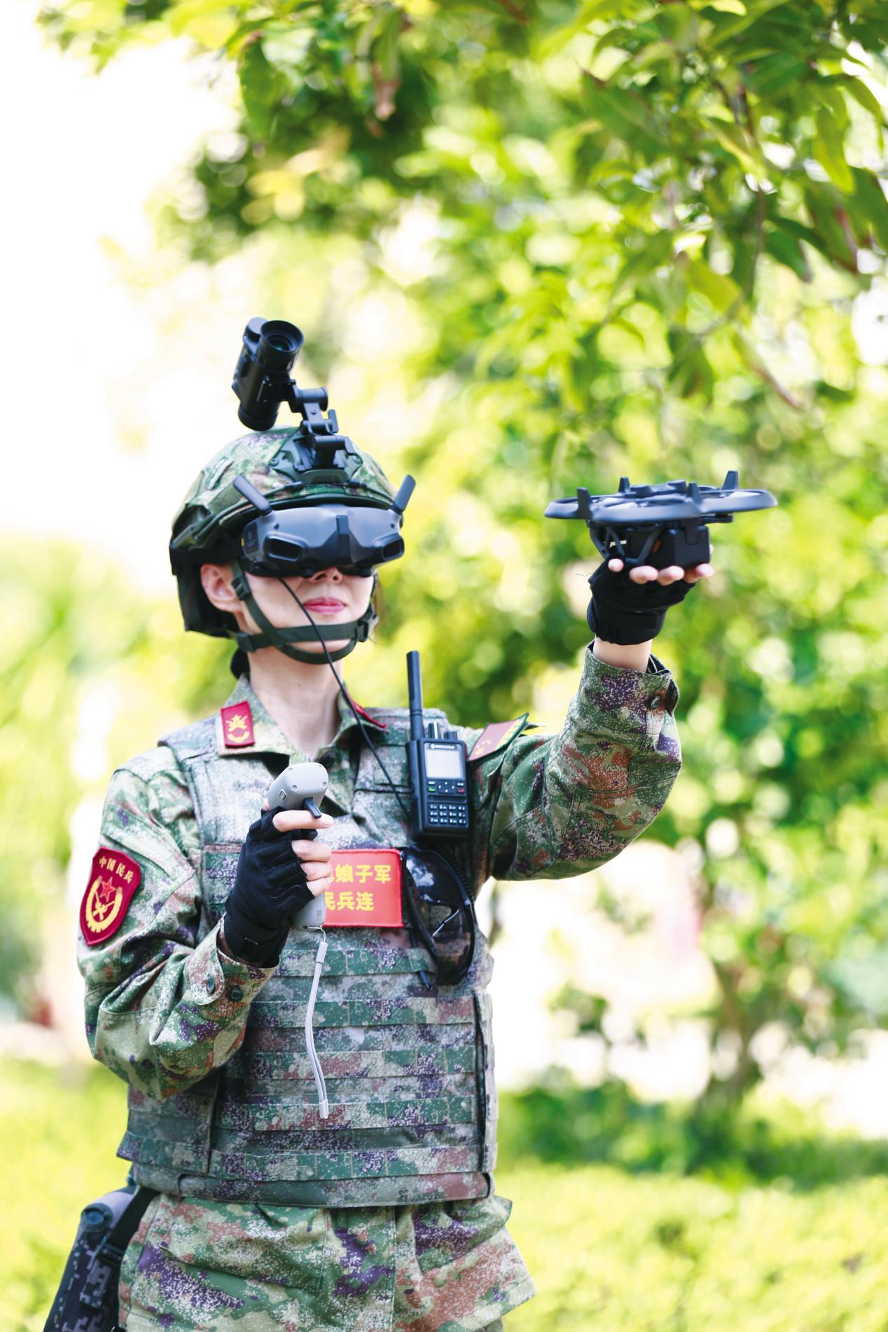 紅色娘子軍民兵連女民兵操作新型科技裝備遂行支援保障任務。