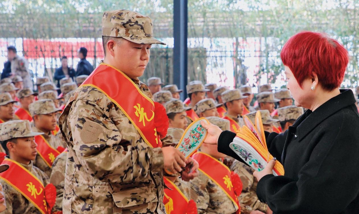 禹州市“擁軍好媽媽”團(tuán)隊成員把親手做的鞋墊送給預(yù)定新兵。(攝影/秦向磊)