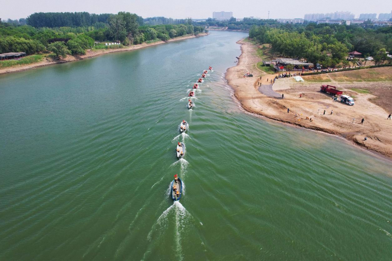 禹州市民兵在防汛搶險綜合演練中開展駕駛沖鋒舟前出救援訓(xùn)練。(攝影/陳文龍)