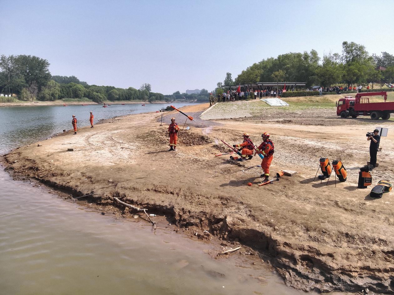 禹州市民兵在防汛搶險綜合演練中投放救援拋繩器。(攝影/葛彥峰)