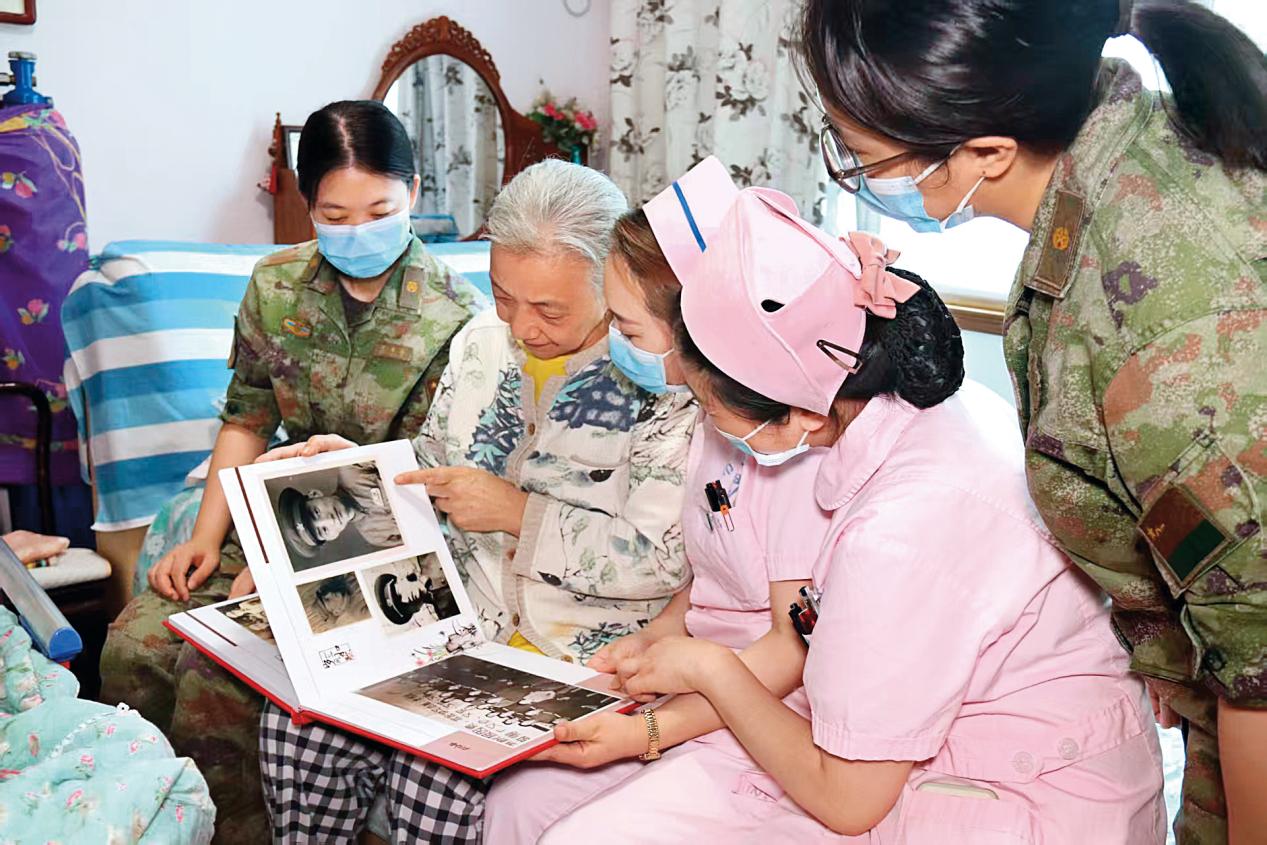 劉潔家屬與她所在干休所醫(yī)護(hù)人員翻看反映劉潔戰(zhàn)斗生活的珍貴照片。