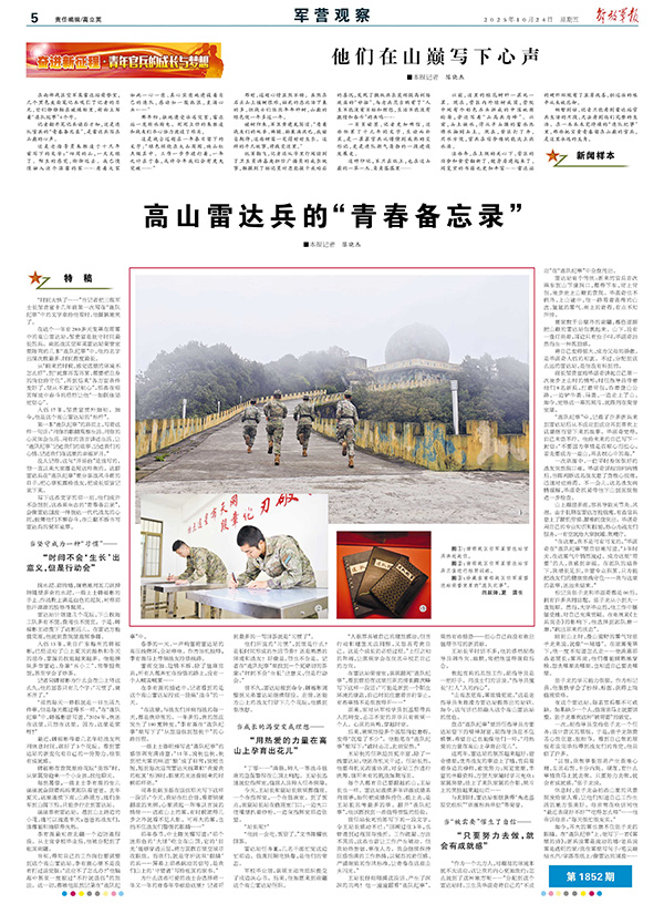 紙頁翻飛,記者還從字里行間讀到了衛(wèi)生員湯嘉庚擔任廣播員的成長故事,觸摸到了標記員付忠彪提干成功后的喜悅,發(fā)現(xiàn)了操縱班長莫輝提高訓練效益的“妙招”,與老兵范吉鵬有了“人生不能沒有目標和理想,生活不能沒有激情和奮斗”的共鳴……