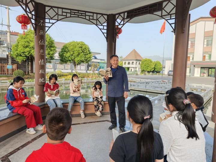 2025年4月23日,浙江衢州白沙村舉辦世界讀書日活動(dòng),一位白沙村村民給當(dāng)?shù)匦W(xué)生講村志里的故事。新華社記者 魏董華 攝