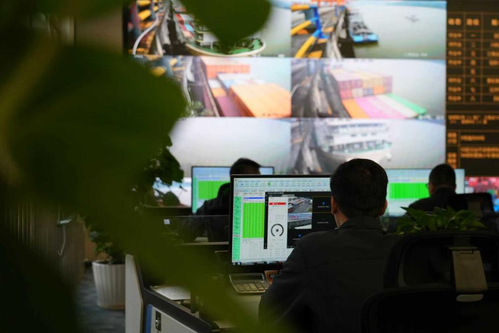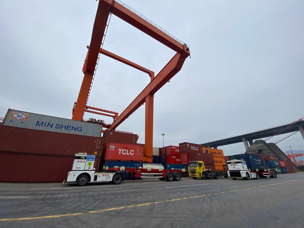 貨輪上五顏六色的集裝箱被岸橋穩(wěn)穩(wěn)“夾”起,堆場(chǎng)上擺滿貨物,秋冬時(shí)節(jié)的果園港依舊熱火朝天。指著遠(yuǎn)程控制室巨大屏幕上的兩臺(tái)白色無人駕駛集裝箱卡車,劉煉說:“港口建設(shè)邁向智能化、綠色化,為果園港提升多式聯(lián)運(yùn)物流效率、承擔(dān)更多開放功能,提供了堅(jiān)實(shí)支撐。”