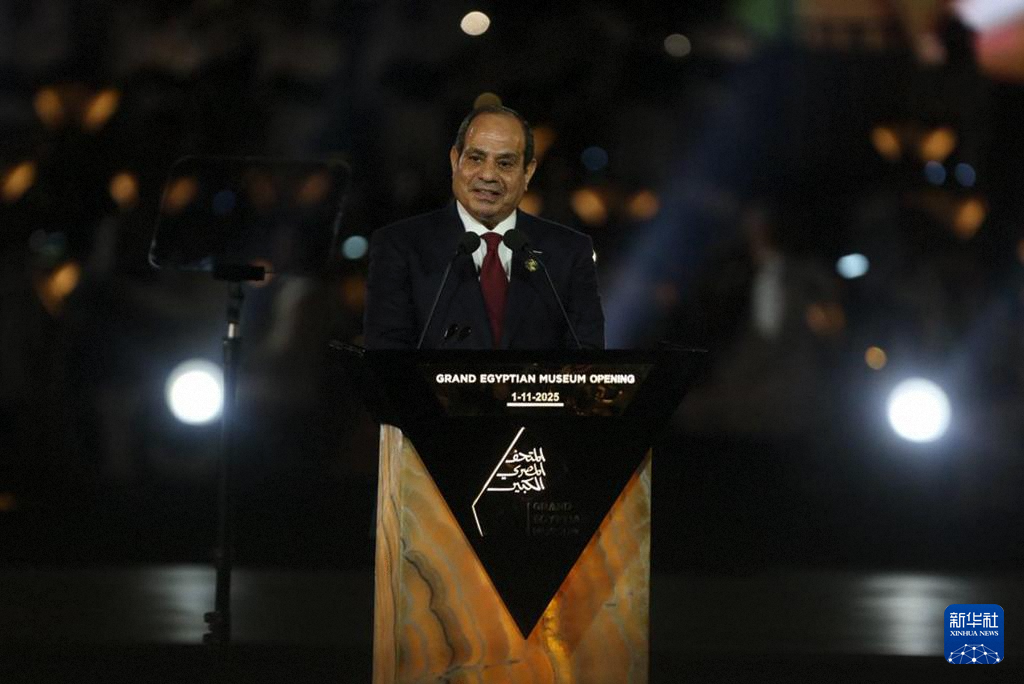 11月1日,在埃及吉薩,埃及總統(tǒng)塞西在開館儀式上致辭。世界最大單一文明博物館——大埃及博物館11月1日正式開館。數(shù)十個由各國元首、政府首腦、地區(qū)和國際組織負責人率領的官方代表團參加了當晚舉行的開館儀式。?新華社發(fā)