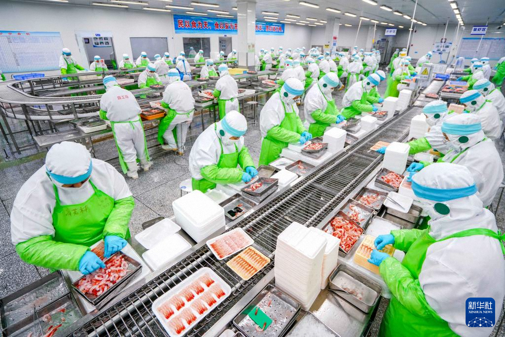 11月10日,山東日照美佳集團的工作人員將甜蝦產(chǎn)品裝盤。新華社發(fā)(王敬之 攝)