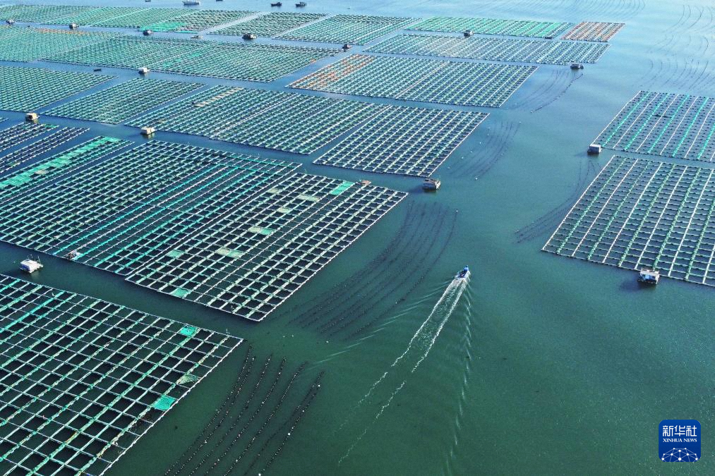 11月10日,在山東省榮成市桑溝灣海洋牧場,養(yǎng)殖工人在養(yǎng)殖區(qū)穿梭作業(yè)(無人機照片)。新華社發(fā)(王福東 攝)