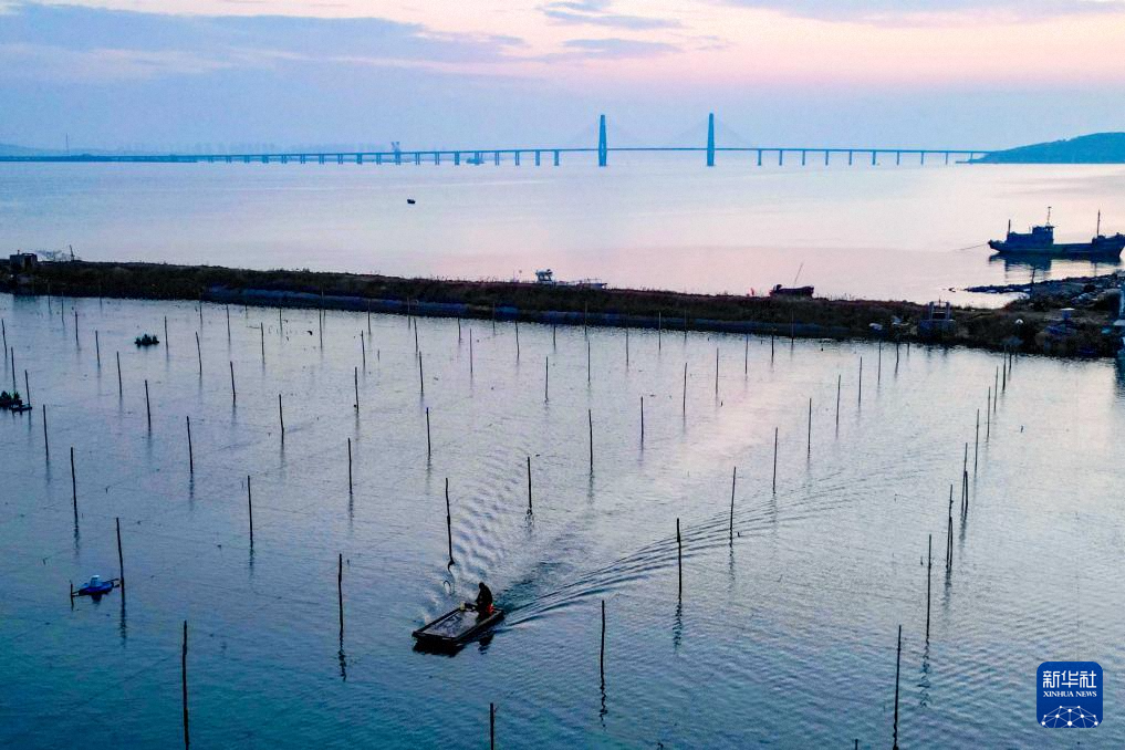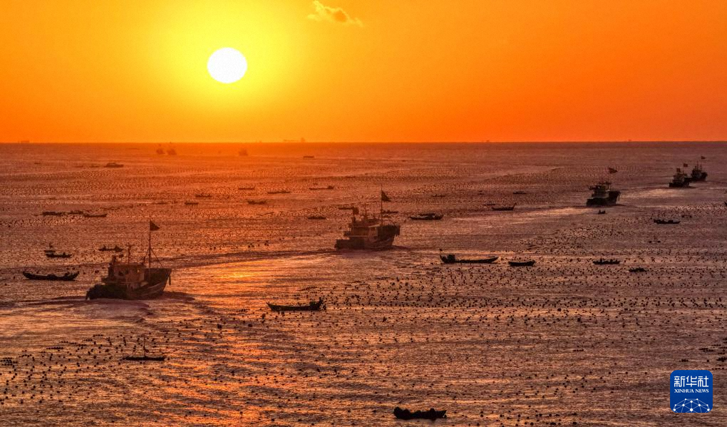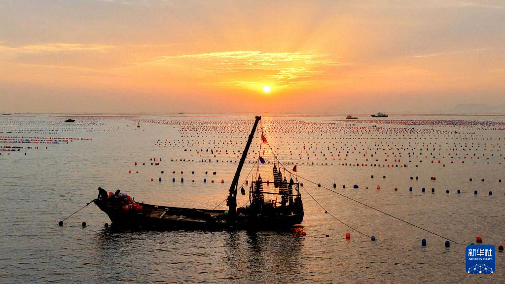 11月11日,在山東青島西海岸新區(qū)海域,養(yǎng)殖戶在收獲牡蠣和扇貝(無人機照片)。新華社發(fā)(俞方平 攝)