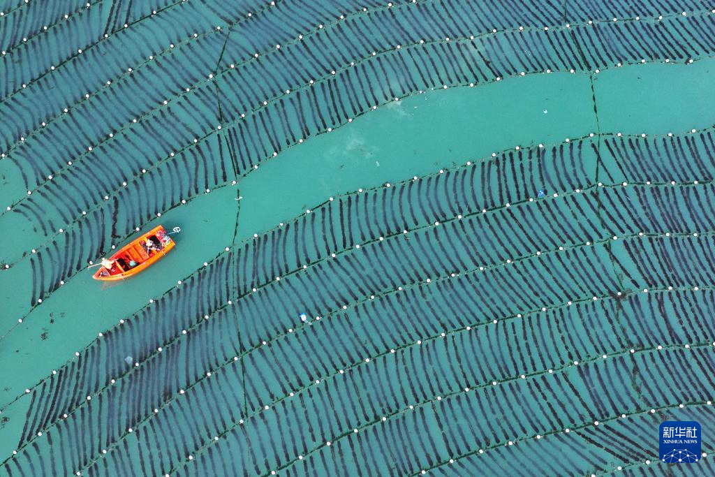 11月11日,在山東省榮成市愛倫灣海洋牧場海帶育苗區(qū),養(yǎng)殖工人在管護海帶苗(無人機照片)。新華社發(fā)(王福東 攝)