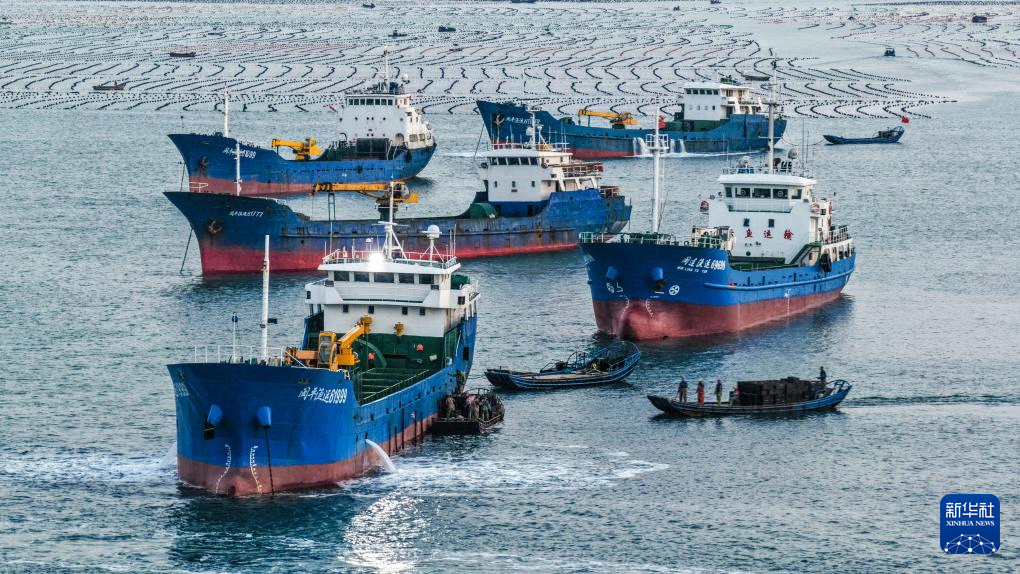 11月11日,在山東省榮成市愛倫灣海洋牧場,運鮮船在裝運鮑魚南下福建越冬(無人機照片)。新華社發(fā)(王福東 攝)
