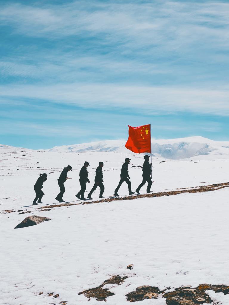海拔5600米,在崗布冰川的注視下,鮮紅的五星紅旗和移動(dòng)的藏藍(lán)身影,成為天地間最醒目的色彩。他們攀上冰磧壟,踏查邊境情況,不放過任何一絲異常。