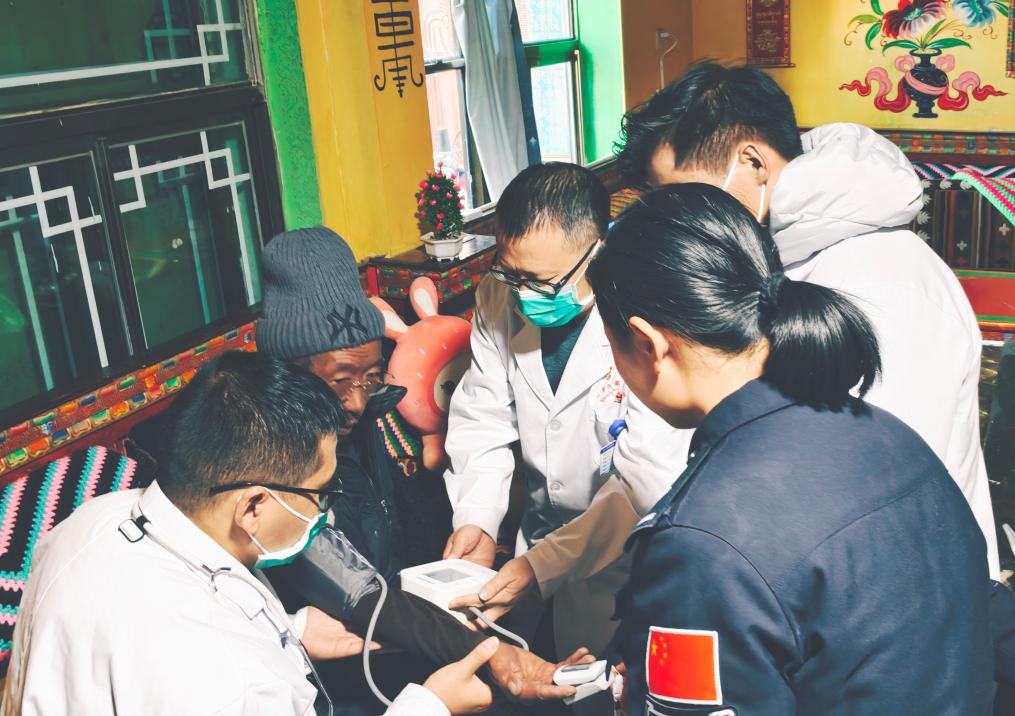 11月6日,普瑪江塘邊境派出所民警與湖南省援藏醫(yī)生江志超、趙啟等一同到牧民家中義診。新華社記者任沁沁攝
