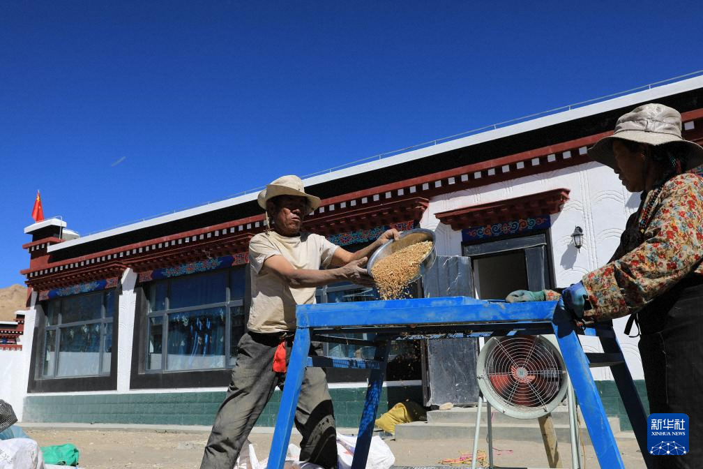 西藏定日縣曲洛鄉(xiāng)措昂村村民旦增(左)在自家新房院子里加工收獲的青稞(10月24日攝)。