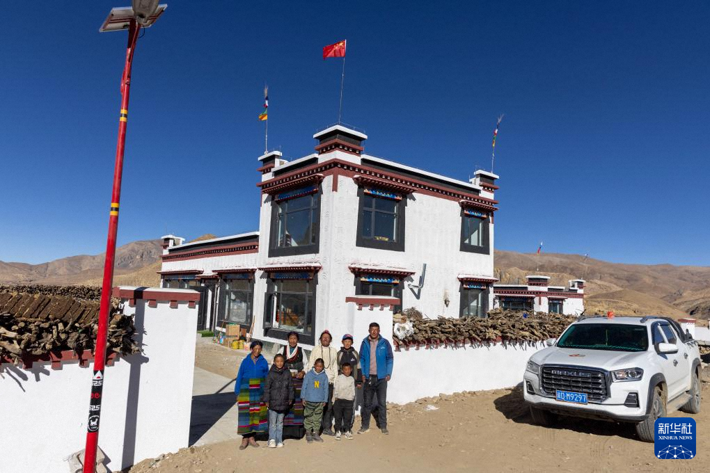 西藏定日縣曲洛鄉(xiāng)措昂村村民達瓦卓瑪(后中)一家在新房前準備拍攝“全家?!保?0月27日攝)。