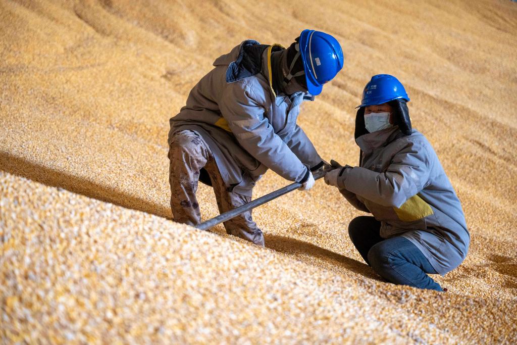 2025年10月31日,在黑龍江省雙鴨山市的中糧天興物流園區(qū)倉儲庫,工人進(jìn)行扦樣作業(yè),了解儲存?zhèn)}內(nèi)大豆水分、雜質(zhì)以及蟲害等情況。新華社記者 張濤 攝