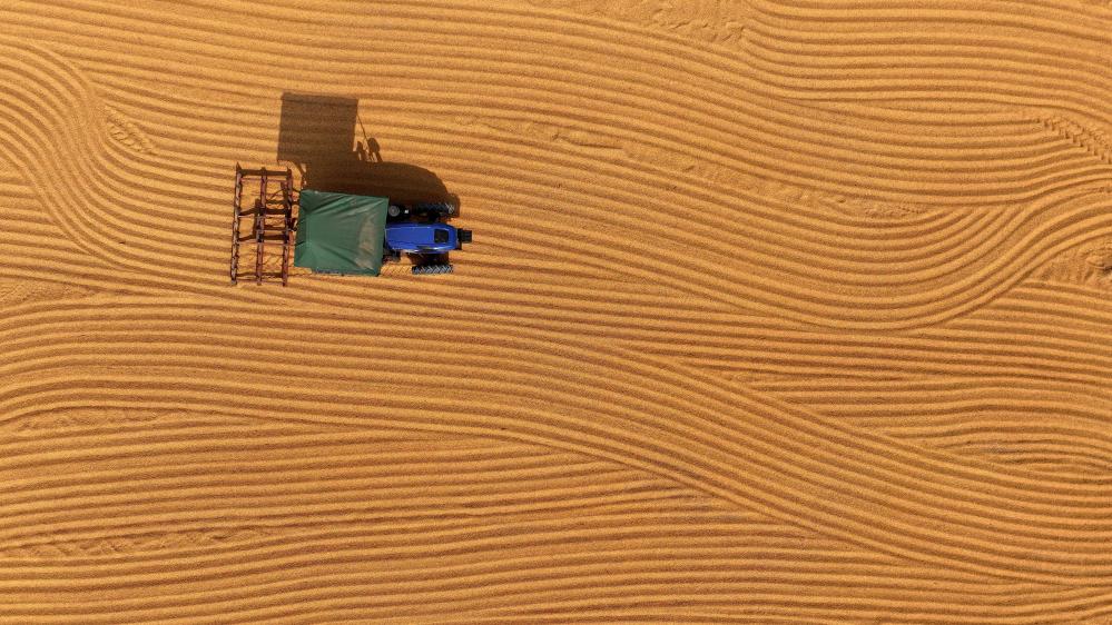 在新疆昌吉回族自治州奇臺縣西北灣鎮(zhèn),農(nóng)戶在田間收獲小麥(2024年7月9日攝,無人機(jī)照片)。新華社記者 丁磊 攝