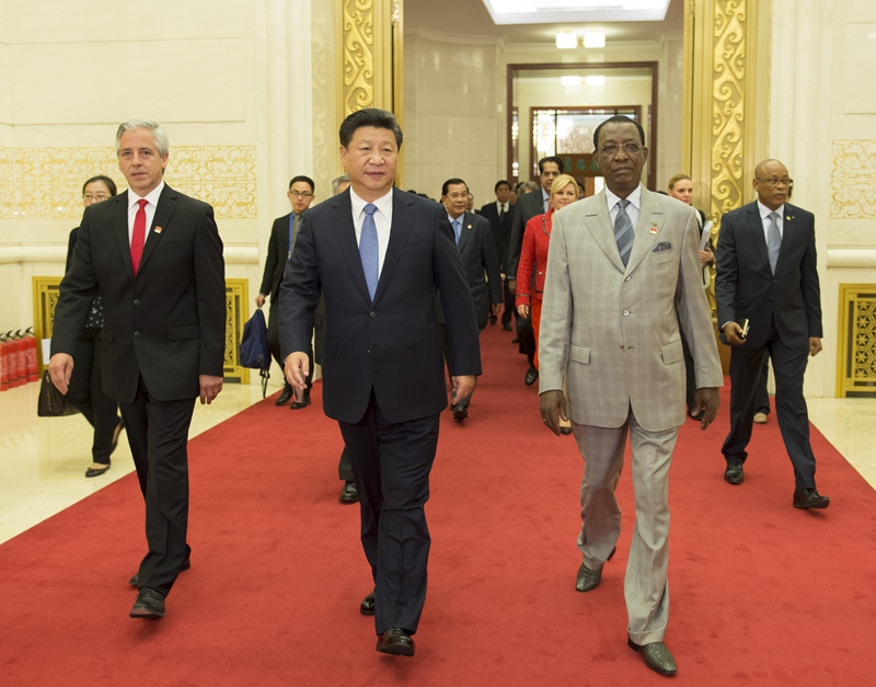 10月16日,2015減貧與發(fā)展高層論壇在北京人民大會(huì)堂舉行。國家主席習(xí)近平出席論壇并發(fā)表題為《攜手消除貧困 促進(jìn)共同發(fā)展》的主旨演講。這是習(xí)近平與出席論壇的外國領(lǐng)導(dǎo)人步入會(huì)場。新華社記者李學(xué)仁攝