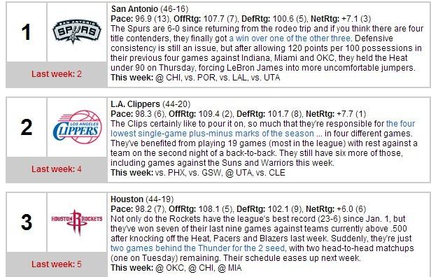 中國網體育訊 北京時間3月11日 NBA官方公布了最新一期球隊實力榜,馬刺升至榜首,快船排名第二,火箭排名第三。熱火狂降三位,排至第四位,勇士排名第五,雷霆降至第六位。湖人上升三位,排至第19位。