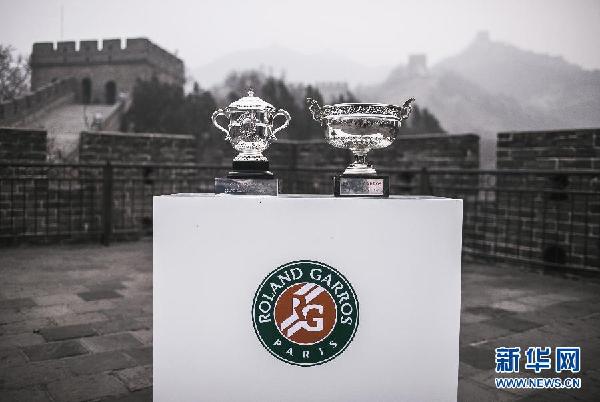 ??? 這是3月27日在北京八達(dá)嶺長城拍攝的法網(wǎng)冠軍獎杯火槍手杯(右)和蘇珊-朗格朗杯。 3月27日至28日,法網(wǎng)冠軍獎杯火槍手杯和蘇珊-朗格朗杯將在北京長城、故宮角樓等多個(gè)著名景點(diǎn)進(jìn)行展出。