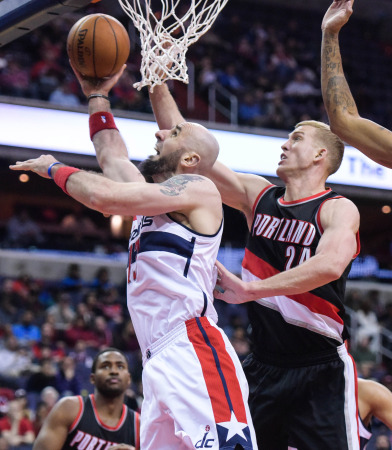 1月18日,奇才隊(duì)球員戈塔特(左)在比賽中上籃。