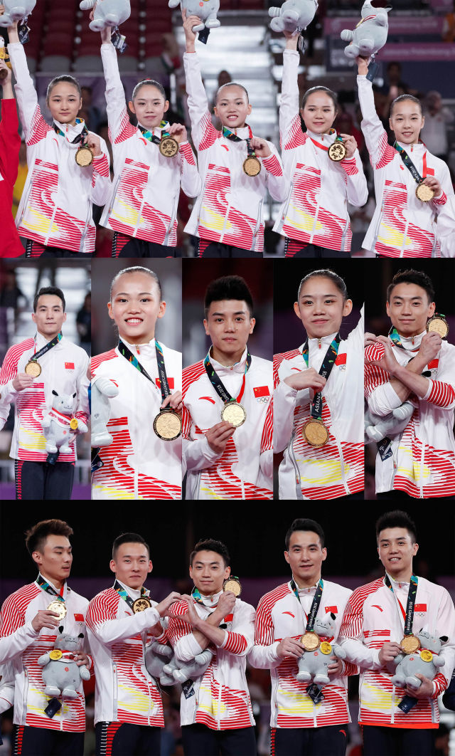 圖為中國體操隊(duì)金牌選手。(拼版照片)