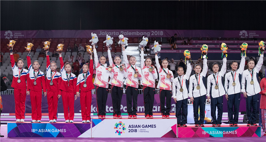 圖為8月22日,冠軍中國(guó)隊(duì)(中)、亞軍朝鮮隊(duì)(左)和季軍日本隊(duì)在第18屆亞運(yùn)會(huì)體操女子團(tuán)體頒獎(jiǎng)儀式上。中國(guó)隊(duì)以165.250分獲得冠軍。新華社記者朱煒攝