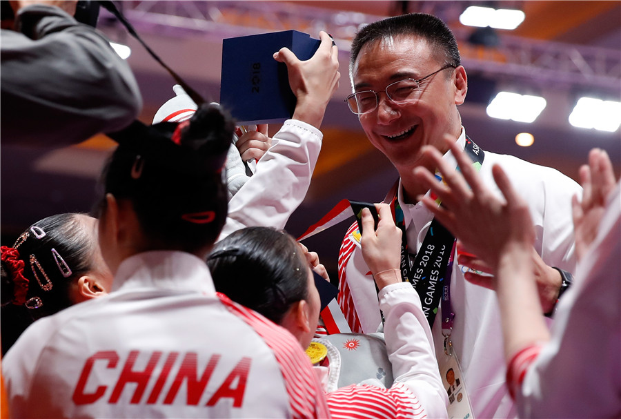 圖為8月22日,中國(guó)隊(duì)選手們?cè)诘?8屆亞運(yùn)會(huì)體操女子團(tuán)體頒獎(jiǎng)儀式后將金牌掛在女隊(duì)主教練喬良的脖子上。中國(guó)隊(duì)以165.250分獲得冠軍。新華社記者王麗莉攝
