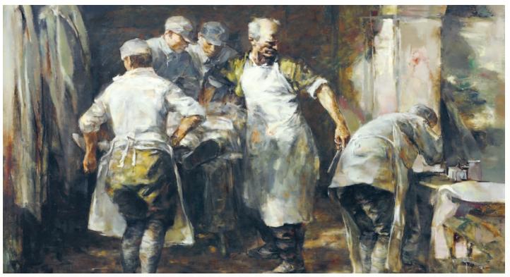 2015年,我受中國人民革命軍事博物館之邀,用畫筆再現(xiàn)了那個刻骨銘心的時刻——1939年深秋,白求恩在河北淶源的一座小廟里,為傷員做完最后一臺手術(shù)。創(chuàng)作《戰(zhàn)火中的白求恩》這幅油畫時,我仿佛置身于那座搖搖欲墜的小廟,硝煙刺痛雙眼,爆炸聲震耳欲聾。但我的眼前,始終有一個挺拔的身影。他明知危險,卻依然用生命踐行著醫(yī)者誓言。我想,這幅作品不僅凝固了歷史,更讓觀者感受到超越時空的精神力量。