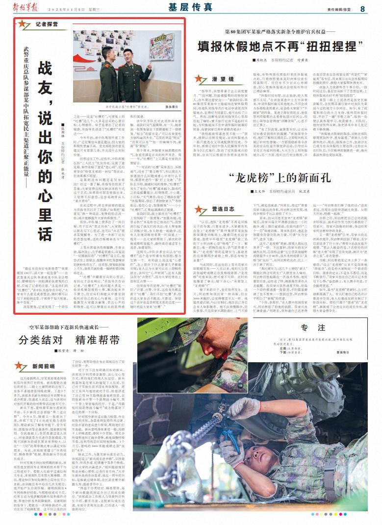 “‘吐槽’中藏著官兵的心里話,有回應(yīng)才會有響應(yīng)。”吳指導(dǎo)員告訴記者,“吐槽欄”上的問題大多是一些容易被忽視的小事,解決起來并不費力,但官兵們卻能從中感受到組織對自己的關(guān)心與重視。這不僅能激發(fā)大家建言獻策、表達心聲的積極性,還可以增強官兵的獲得感和歸屬感。
