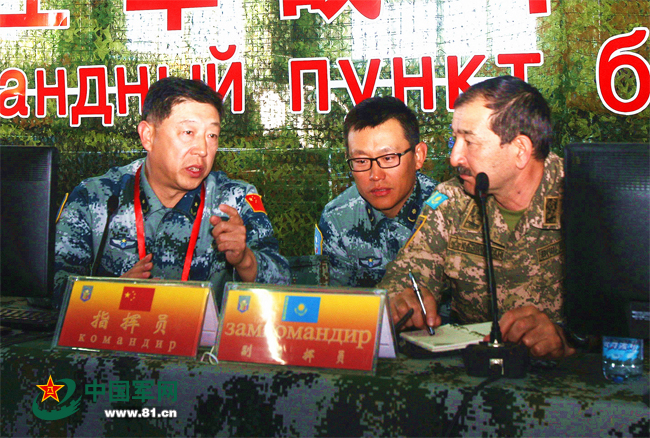在上合組織“和平使命-2014”聯(lián)合反恐軍演空軍戰(zhàn)斗群指揮所,空軍戰(zhàn)斗群指揮員馮愛(ài)旺少將(左),與外方派出的副指揮員溝通交流。張東賀 攝