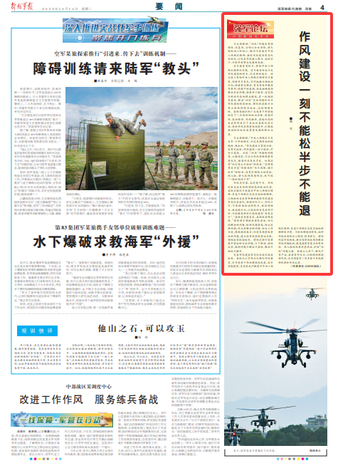 作風是形象,也是戰(zhàn)斗力。作風優(yōu)良是我軍的鮮明特色和政治優(yōu)勢。各級應(yīng)鍥而不舍落實中央八項規(guī)定精神、軍委十項規(guī)定及其實施細則精神,以徹底的自我革命精神推進作風建設(shè)常態(tài)化長效化,堅持內(nèi)化于心、外化于行,不斷提高政治判斷力、政治領(lǐng)悟力、政治執(zhí)行力,以高度的自覺共同守護、不斷擦亮新時代黨的建設(shè)“金色名片”?!吧瞥φ卟炱浔?,善理疾者絕其源。”要堅持不懈抓好整改整治,對已經(jīng)解決的問題,抓好鞏固提高,防止反彈回潮;對正在解決的問題,加大工作力度,跟蹤推進落實;對需長期整改整治的問題,建立經(jīng)常性整改整治臺賬,確保抓常抓細抓長。特別是緊盯需要集中整治的突出問題,上下聯(lián)動、持續(xù)攻堅,做到問題不解決不罷休、解決不徹底不撒手。