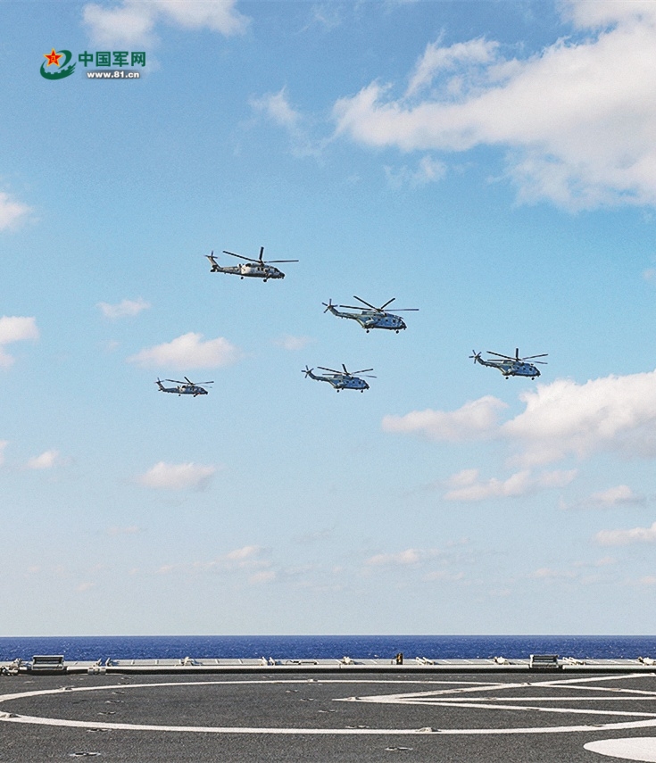 “艦載直升機起降部署!”接到命令,艦載直升機轉運小組快速將艦載直升機轉運至甲板。鐵翼飛旋,數架直升機騰空而起,新一輪訓練在海天之間展開。