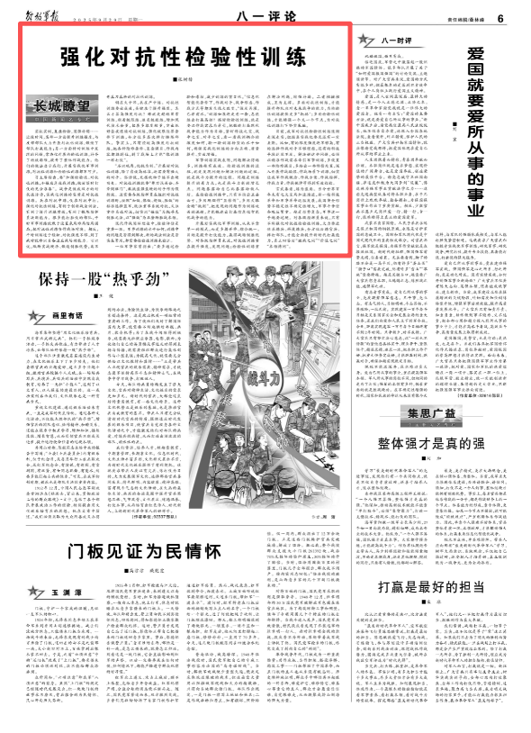 言武備者,練為最要。當(dāng)今世界百年未有之大變局加速演進(jìn),新一輪科技革命和軍事革命迅猛發(fā)展,我國(guó)安全形勢(shì)不穩(wěn)定性不確定性增大,軍事斗爭(zhēng)任務(wù)艱巨繁重。越是形勢(shì)復(fù)雜,軍事這一手越要過(guò)硬。對(duì)各級(jí)指揮員來(lái)說(shuō),只有不斷強(qiáng)化對(duì)抗性檢驗(yàn)性訓(xùn)練,大力推進(jìn)體系練兵、科技練兵,全方位歷練官兵、摔打部隊(duì),才能全面提升新時(shí)代打贏能力,真正回答好“勝戰(zhàn)之問(wèn)”“價(jià)值之問(wèn)”“本領(lǐng)拷問(wèn)”。