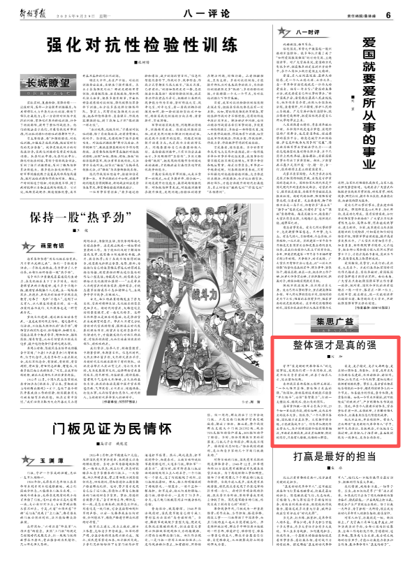 獨(dú)木不成林,單兵難排陣。帶兵人應(yīng)向那些“最美新時代革命軍人”學(xué)習(xí),樹牢大局意識、系統(tǒng)觀念,不僅把自己搞過硬,還要把人才培養(yǎng)好,真正做到既為一域爭光、更為全局添彩。