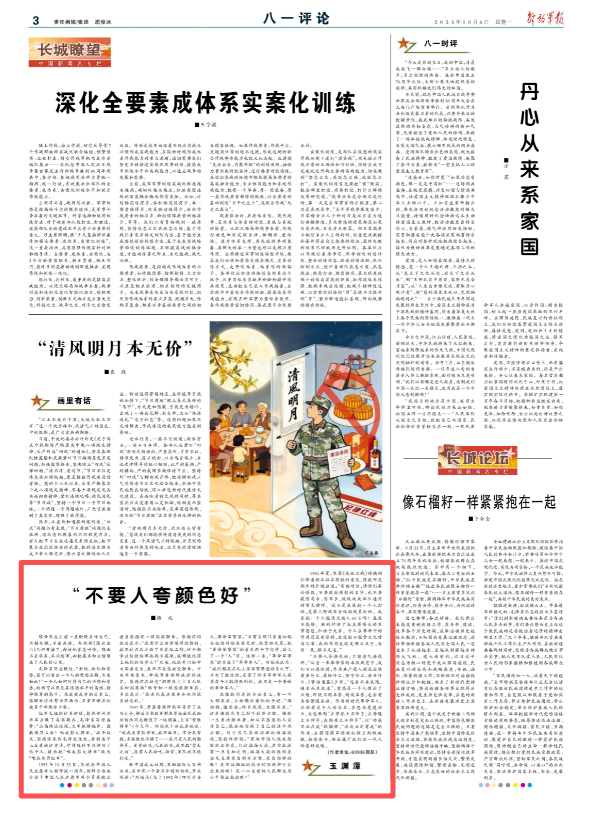 “不要人夸顏色好,只留清氣滿乾坤?!睆睦弦惠吀锩业淖咳伙L(fēng)范中,我們可以感悟到,作為共產(chǎn)黨人到底應(yīng)該看重什么、看輕什么,堅(jiān)守什么、舍棄什么?!顿Y治通鑒》上講,“逃名而名我隨,避名而名我追”,意思是一個(gè)人做出了業(yè)績,即使不圖名譽(yù)、避談名譽(yù),也會(huì)有名譽(yù)緊隨其后。作為新時(shí)代革命軍人,應(yīng)該看淡個(gè)人功與名,多想為黨建功業(yè),自覺做到“在榮譽(yù)上不伸手,在待遇上不伸手,在物質(zhì)上不伸手”,以“功成不必在我”的胸襟、“功成必定有我”的作為,在強(qiáng)國強(qiáng)軍的新征程上銜枚疾馳、接續(xù)奮斗,跑出屬于我們這一代人的最好成績。