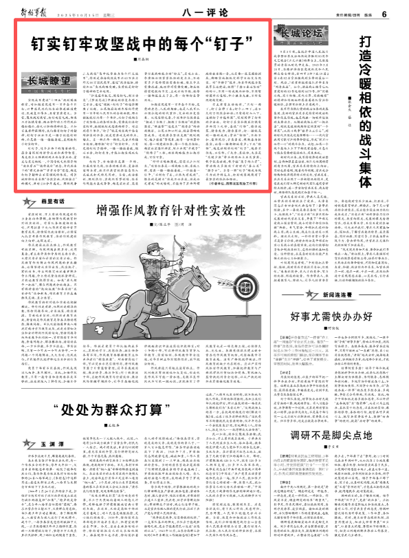 習(xí)主席曾生動地講,“只釘一兩下,釘子會掉下來;釘個三四下,過不久釘子仍然會松動;只有連釘七八下,這顆釘子才能牢固”,深刻闡釋了釘牢的方法論。釘釘子其實和鐵匠打鐵有異曲同工之妙,善使“巧勁”,精準(zhǔn)施策、精準(zhǔn)發(fā)力、精準(zhǔn)落位,釘一錘就見到一錘的成效;拿出“韌勁”,不折不扣、雷厲風(fēng)行、求真務(wù)實、敢做善為抓落實,讓每一錘都擲地有聲;下足“狠勁”,越是碰到難釘?shù)摹搬斪印?,越要不怕鬼、不信邪,下大力、真使勁,尤其是“關(guān)鍵少數(shù)”帶頭迎難而上至關(guān)重要,敢于較真碰硬,敢于接“燙手的山芋”,帶動絕大多數(shù)攻下新時代“婁山關(guān)”“臘子口”。當(dāng)每一顆“釘子”都成為戰(zhàn)斗力躍升的支點,打好攻堅戰(zhàn)便有了最堅實的依托和保證。