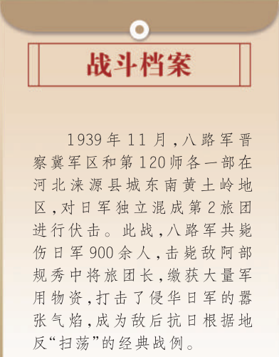 1939年11月24日,毛澤東等在致八路軍總部的電報(bào)中詢問:“日本陸軍省發(fā)表阿部中將在河北上莊子附近被擊斃,榮臻應(yīng)查明系我何部所擊斃,是否即屬銀坊戰(zhàn)役,加以敘述報(bào)告我們。各方應(yīng)在報(bào)紙上作文,粉碎游而不擊之誣言?!边@份指令源于十幾天前的黃土嶺戰(zhàn)斗。從電報(bào)內(nèi)容可見,當(dāng)時(shí)作戰(zhàn)部隊(duì)僅知摧毀了日軍臨時(shí)指揮所,尚未意識到同時(shí)擊斃了日軍所謂“名將之花”阿部規(guī)秀。