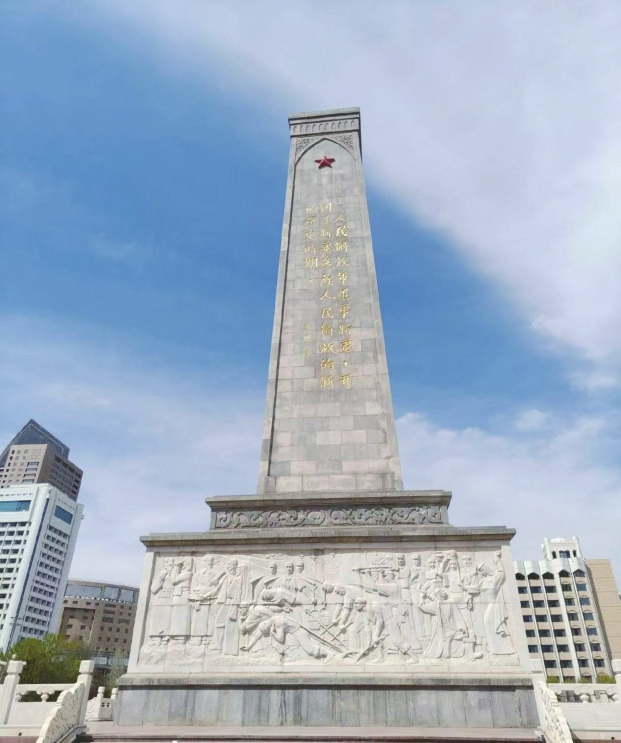 在天山腳下的烏魯木齊市人民廣場(chǎng)中央,一座莊嚴(yán)巍峨的紀(jì)念碑直插云霄,這便是中國(guó)人民解放軍進(jìn)軍新疆紀(jì)念碑。紀(jì)念碑坐北朝南,由碑體、基座和平臺(tái)三部分構(gòu)成,碑高32.6米,四周粘貼厚12厘米的花崗巖。碑座四面,每面近30平方米;平臺(tái)兩層共八個(gè)臺(tái)階,均采用產(chǎn)自新疆的紅色花崗巖鋪制,并設(shè)有漢白玉護(hù)欄。紀(jì)念碑北面鐫刻著王震的題詞——“中國(guó)人民解放軍進(jìn)軍新疆紀(jì)念”;南面則是王恩茂的題詞——“人民解放軍進(jìn)軍新疆,開(kāi)創(chuàng)了新疆各族人民解放的新的歷史時(shí)期”。碑座浮雕刻畫了解放新疆、屯墾戍邊、各民族大團(tuán)結(jié)的壯觀畫面。底座上分別用漢文、維吾爾文鐫刻碑文,全文如下: