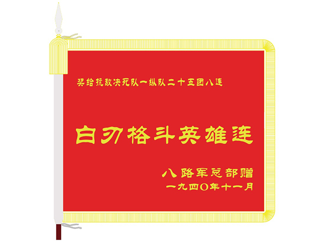 這場(chǎng)戰(zhàn)斗歷時(shí)一個(gè)多小時(shí),殘酷的白刃戰(zhàn)就占半個(gè)多小時(shí),8連共擊斃日寇小隊(duì)長(zhǎng)以下40余名,繳獲輕機(jī)槍2挺、步槍48支、手槍1支。戰(zhàn)后,張萬(wàn)清、牛顯躍、李金標(biāo)、張臘生等同志榮獲戰(zhàn)斗英雄光榮稱號(hào)。八路軍總部授予8連“白刃格斗英雄連”榮譽(yù)稱號(hào),由此,“白刃格斗英雄連”就成為這個(gè)連隊(duì)的光榮稱號(hào),此面榮譽(yù)錦旗至今保存在中國(guó)人民革命軍事博物館。在慶祝中國(guó)人民解放軍建軍90周年大會(huì)上,習(xí)主席強(qiáng)調(diào):“‘狼牙山五壯士’、‘白刃格斗英雄連’、‘劉老莊連’、董存瑞、邱少云、黃繼光等無(wú)數(shù)英雄群體和革命先烈,用生命詮釋了一往無(wú)前的英雄氣概?!?/p>