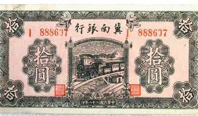▲冀南銀行發(fā)行的拾圓鈔票?!『颖辈┪镌汗﹫D