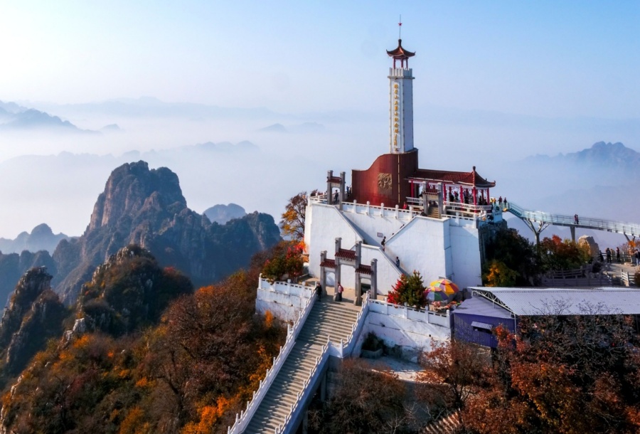 ▲這是狼牙山棋盤陀峰頂?shù)摹袄茄郎轿逵率考o念塔”(2017年10月27日攝,無人機照片)?!?span tag="ueditor-text-tushuo" class="imgdesc" style="text-indent: 2em; ">新華社發(fā)