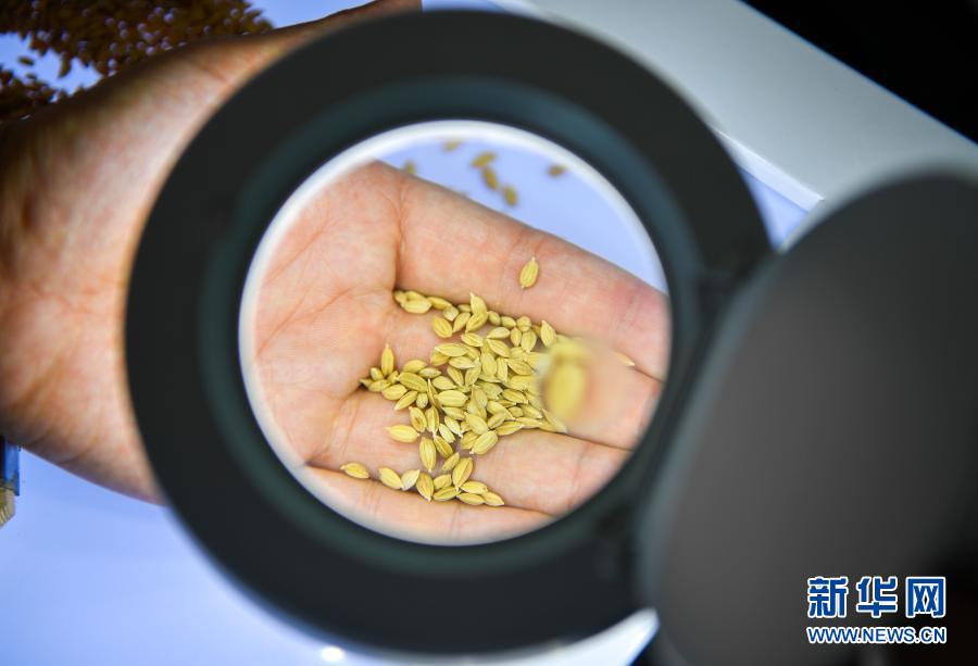 在吉林省吉林市永吉縣一拉溪鎮(zhèn)九月豐家庭農(nóng)場(chǎng),工作人員在實(shí)驗(yàn)室中檢測(cè)一批試種水稻的稻谷外觀(8月12日攝)。新華社記者 許暢 攝