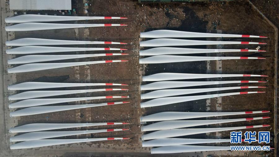 這是河北省威縣一家風(fēng)電設(shè)施生產(chǎn)企業(yè)內(nèi)的大型風(fēng)電機(jī)組葉片(12月8日攝,無(wú)人機(jī)照片)。新華社記者 牟宇 攝