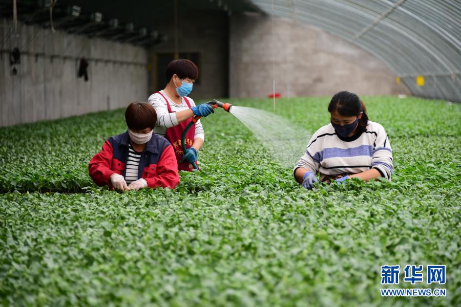 河北曲周縣一家育苗產(chǎn)業(yè)基地的工人在育苗溫棚內(nèi)工作(5月4日攝)。曲周縣積極拓寬產(chǎn)業(yè)扶貧渠道,發(fā)揮當(dāng)?shù)禺a(chǎn)業(yè)優(yōu)勢(shì),統(tǒng)籌協(xié)調(diào)貧困戶利用扶貧資金入股現(xiàn)代設(shè)施農(nóng)業(yè)基地,帶動(dòng)群眾脫貧增收。新華社記者 朱旭東 攝