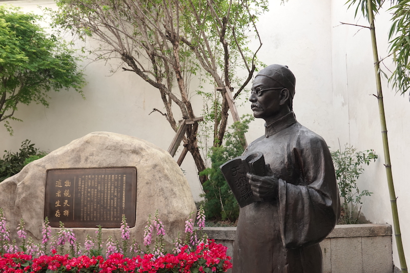 △嚴(yán)復(fù)故居里的銅像。他手捧《天演論》,旁邊石頭上的銅牌寫著“物競天擇,適者生存”。(總臺央廣記者潘毅拍攝)