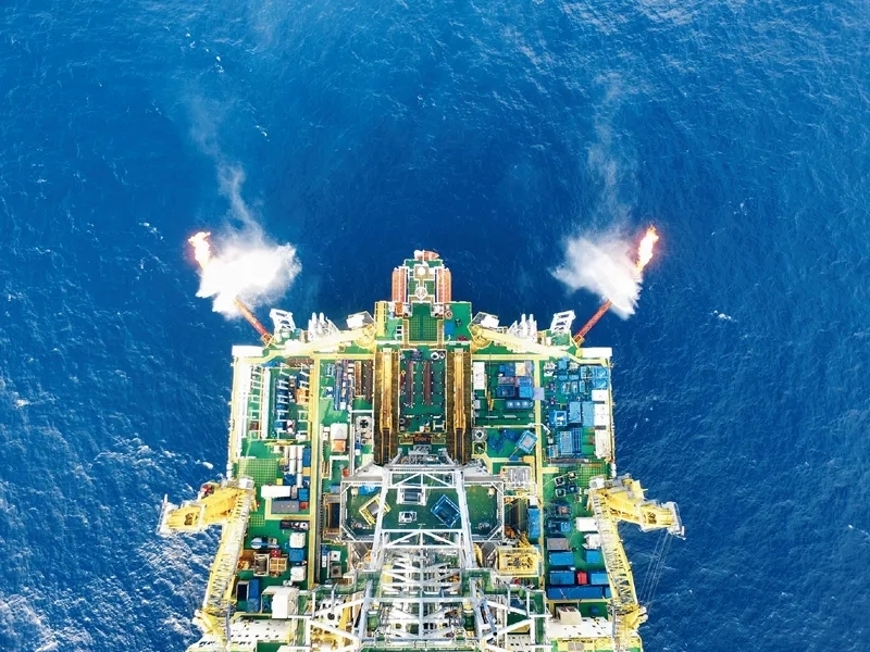 我國加快發(fā)展新能源和可再生能源,能源消費(fèi)結(jié)構(gòu)不斷優(yōu)化。2020年,我國率先實現(xiàn)水平井鉆采深?!翱扇急?。圖為我國海域天然氣水合物第二輪試采平臺“藍(lán)鯨2號”噴出雙火焰(2020年3月25日攝)。新華社發(fā) 廣州海洋地質(zhì)調(diào)查局供圖
