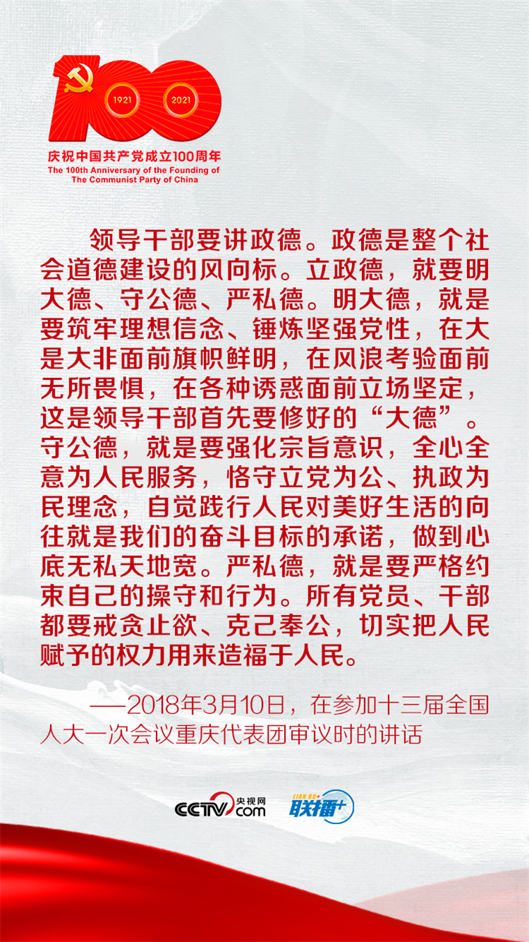 國(guó)無(wú)德不興,人無(wú)德不立。政德絕非私事、小事,而是事關(guān)黨的形象和創(chuàng)造力、凝聚力、戰(zhàn)斗力的大事、要事。央視網(wǎng)《聯(lián)播+》特梳理總書記重要講話,與您一起學(xué)習(xí)。