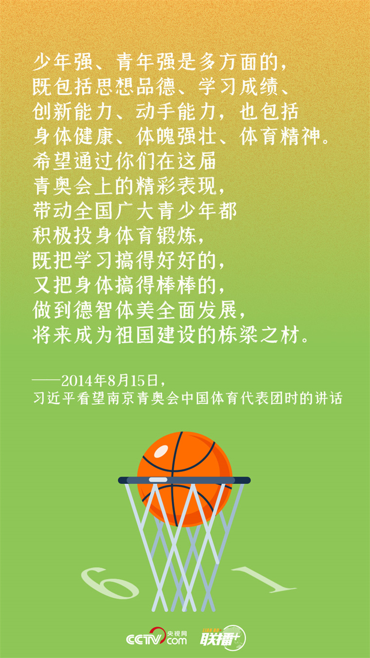 習(xí)近平總書記高度關(guān)注青少年體育運動的普及發(fā)展,在不同場合勉勵孩子們要積極投身體育鍛煉中。