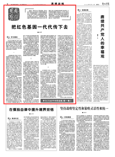 紅色基因是我黨我軍性質(zhì)宗旨本色的集中體現(xiàn),也是我黨我軍的獨特優(yōu)勢和鮮明標識。紅色基因不是抽象和空洞的概念,而是深刻蘊含和生動體現(xiàn)在黨史軍史之中。搞好黨史軍史教育,講好黨史軍史故事,是傳承紅色基因、賡續(xù)紅色血脈的內(nèi)在規(guī)定和客觀要求。在全黨深入推進黨史學(xué)習(xí)教育常態(tài)化長效化之際,習(xí)主席給武警上海市總隊執(zhí)勤第四支隊十中隊全體官兵回信,親切勉勵他們鞏固拓展黨史學(xué)習(xí)教育成果,自覺弘揚偉大建黨精神,當(dāng)好新時代“霓虹燈下的哨兵”,永遠做黨和人民的忠誠衛(wèi)士。我們要牢記領(lǐng)袖囑托,不斷強化學(xué)史鑄魂、開創(chuàng)未來的思想自覺和行動自覺,凝聚起踐行初心使命、矢志奮斗強軍的磅礴力量,讓紅色基因綻放更加璀璨的時代光芒。