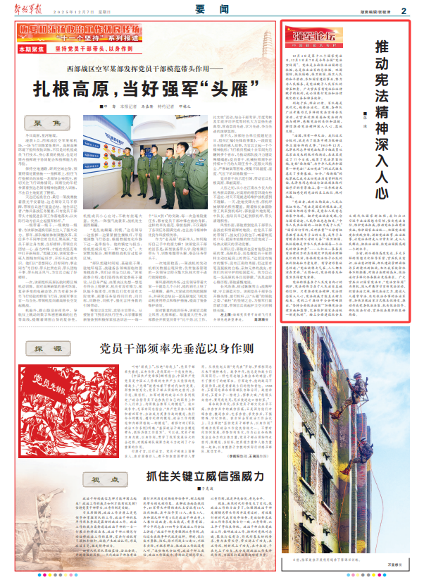 12月4日是第十二個(gè)國(guó)家憲法日,12月1日至7日是今年全國(guó)“憲法宣傳周”。憲法是全面依法治國(guó)的總依據(jù),也是依法治軍的總依據(jù)。鞏固國(guó)防,抵抗侵略,保衛(wèi)祖國(guó),保衛(wèi)人民的和平勞動(dòng),參加國(guó)家建設(shè)事業(yè),努力為人民服務(wù),是憲法賦予人民軍隊(duì)的神圣職責(zé)。廣大官兵享有憲法和法律賦予的權(quán)利,也必須履行憲法和法律規(guī)定的義務(wù)和神圣使命。